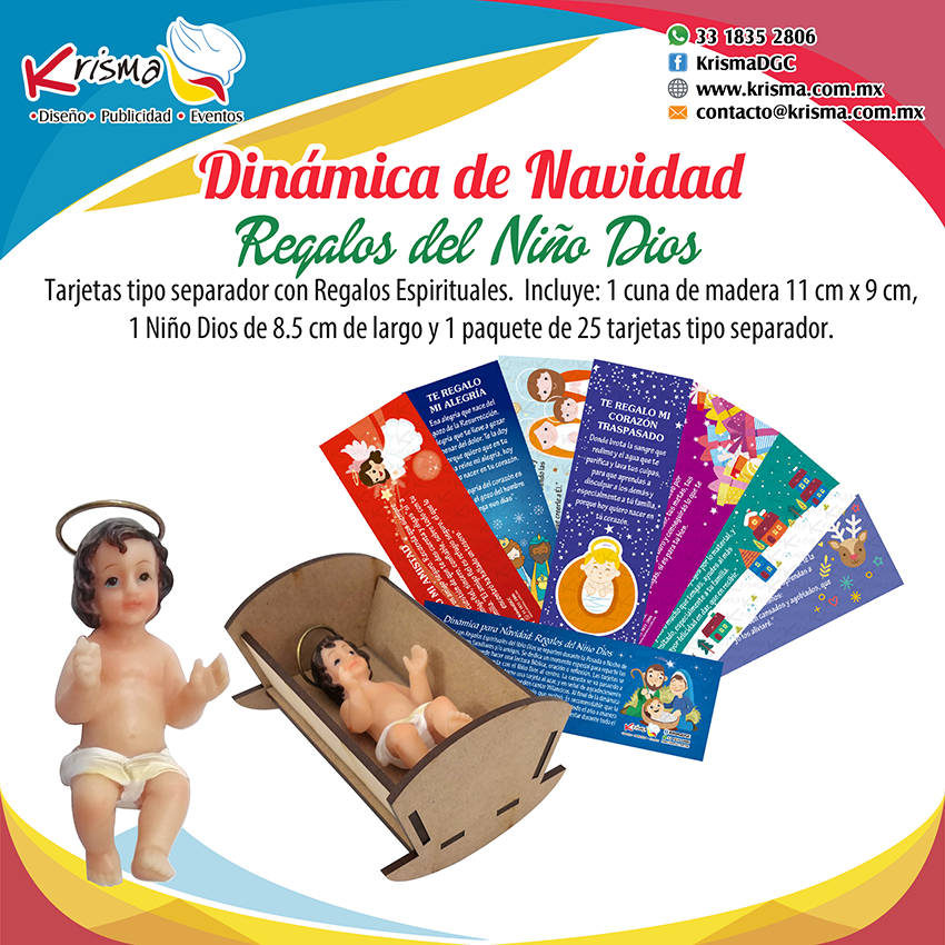 - Previamente se coloca al Niño Dios al centro de una canasta y alrededor de él, se acomodan las Tarjetas de Regalos del Niño Dios, estas tarjetas contienen regalos/virtudes que el Niño Dios trae a cada una de las personas asistentes (niños y adultos).